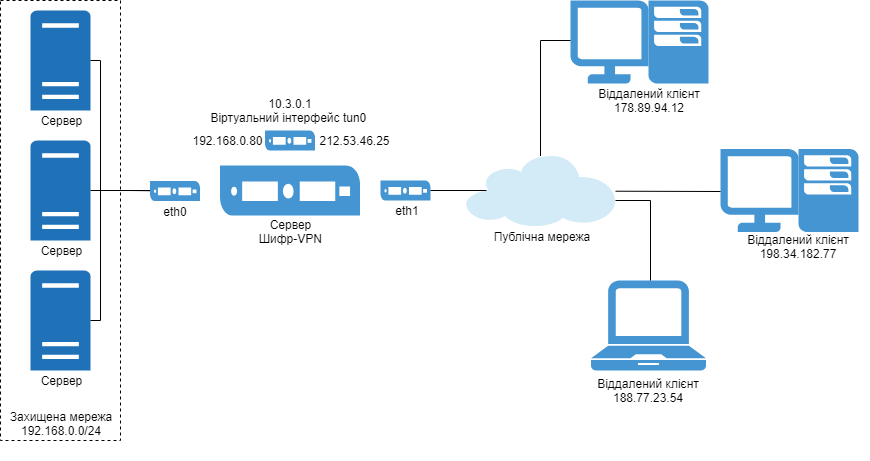 Система криптографічного захисту каналів зв'язку «Шифр-VPN» програмний чи програмно-апаратний комплекс, який ґрунтується на протоколі OpenVPN з підтримкою SSL/TLS, для забезпечення конфіденційності при передачі даних в комп’ютерних мережах.